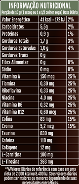 INGREDIENTES: LEITE DE COCO EM PÓ, CACAU ALCALINO, CAFÉ SOLÚVEL, MIX DE TAURINA E CAFEÍNA (MALTODEXTRINA, TAURINA E CAFEÍNA), L-TIROSINA, EXTRATO DE CHÁ VERDE, L-CARNITINA, CANELA PÓ, CÚRCUMA PÓ, PIMENTA PRETA PÓ, COLÁGENO HIDROLISADO, GENGIBRE EM PÓ, COLINA, NIACINA, CIANOCOBALAMINA, RIBOFLAVINA, CLORIDRATO DE PIRIDOXINA, MONONITRATO DE TIAMINA, ACETATO DE RETINOL E CROMO, AROMATIZANTES, REGULADOR DE ACIDEZ BICARBONATO DE SÓDIO, ANTIUMECTANTE DIÓXIDO DE SILÍCIO E EDULCORANTE NATURAL STEVIA.